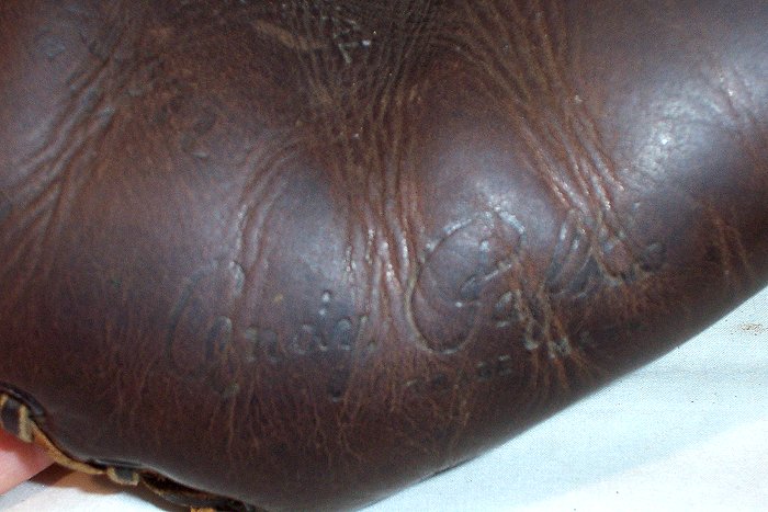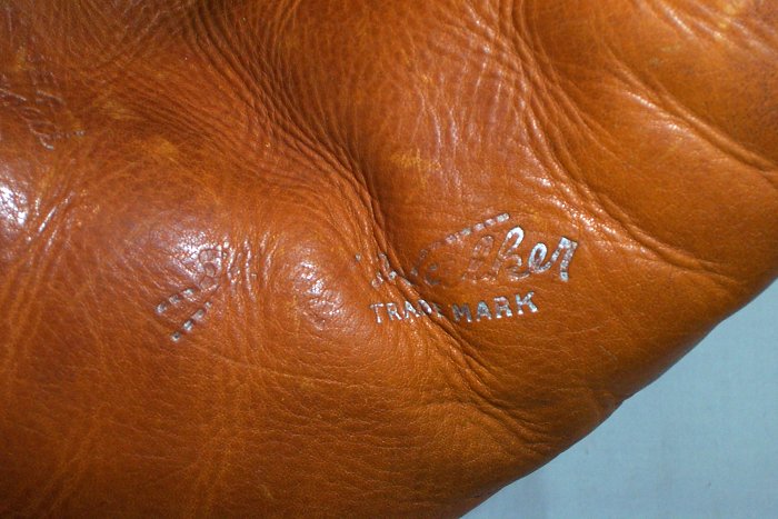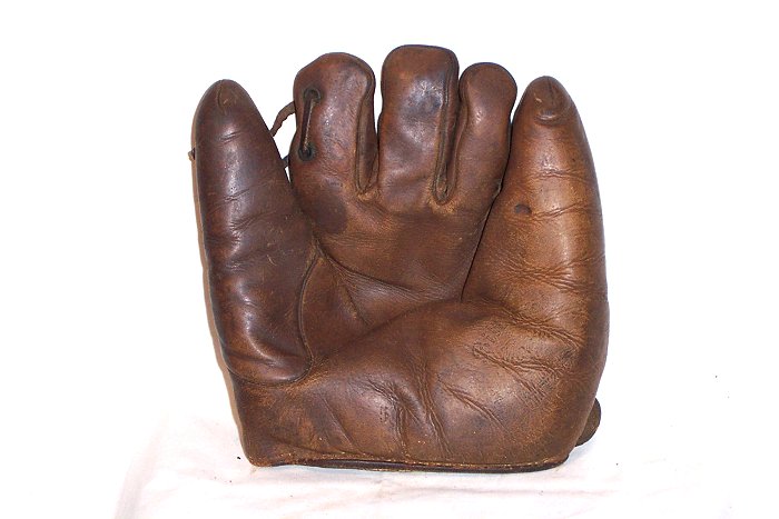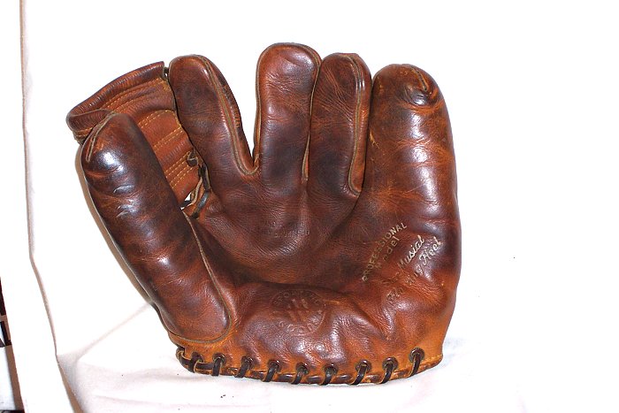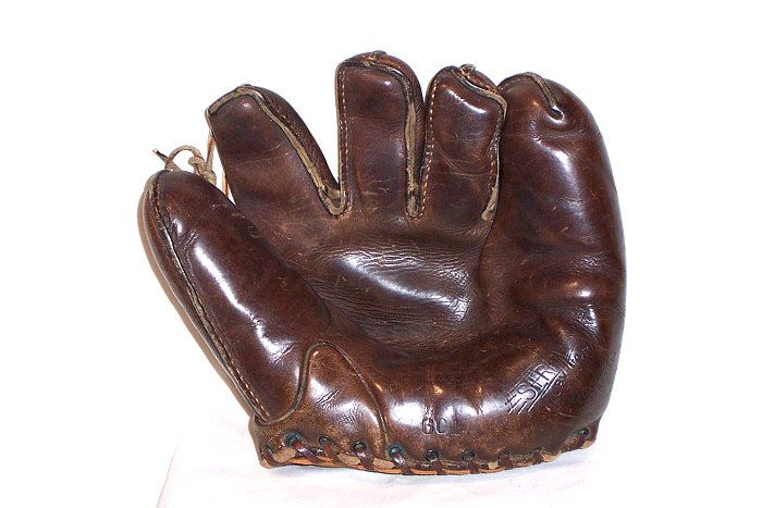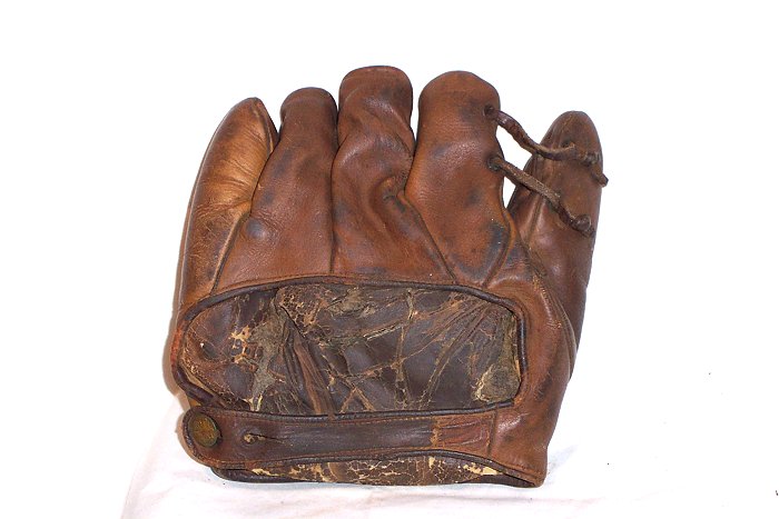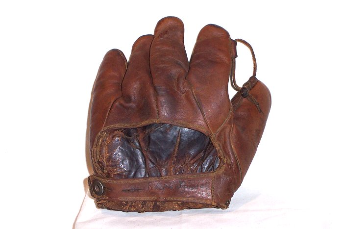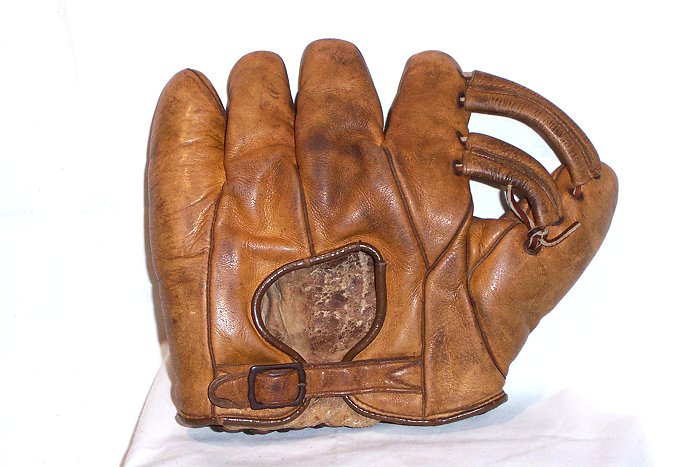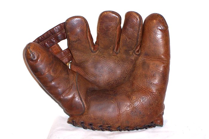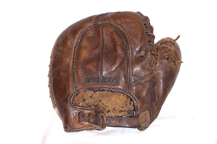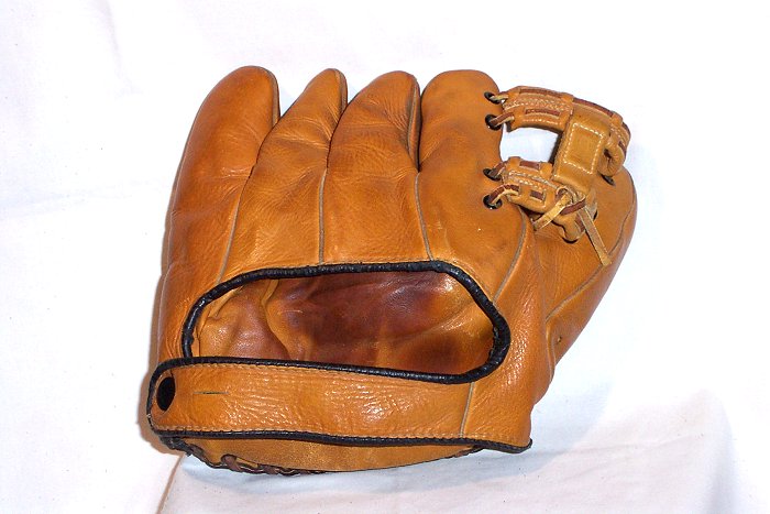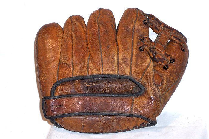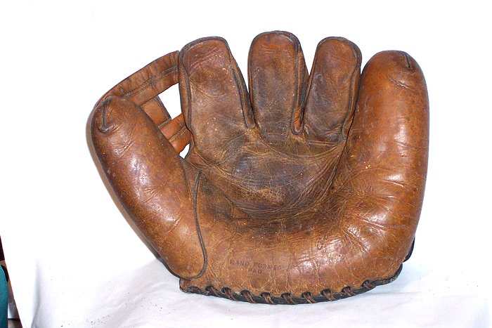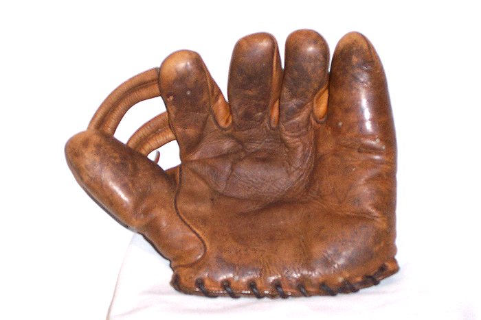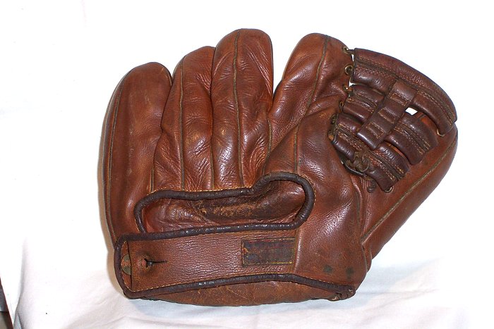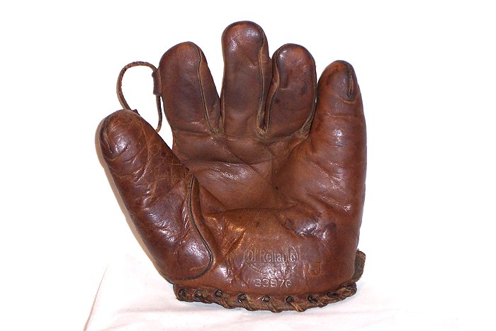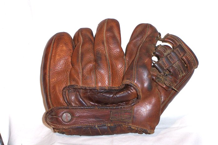 | Ol' Reliable | 3387G | none | Vg- | This is a cool glove with a GREAT brand name - sorta like a dog - or is that Ol' Yeller? Whatever, this is a neat loop-laced web. Lining worn, but great overall look. (Another sentimental one) | $75 (SOLD) | |
